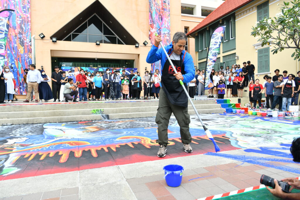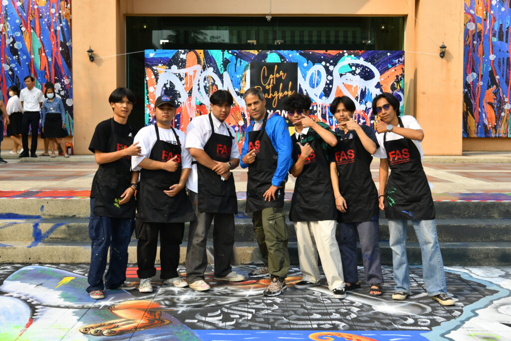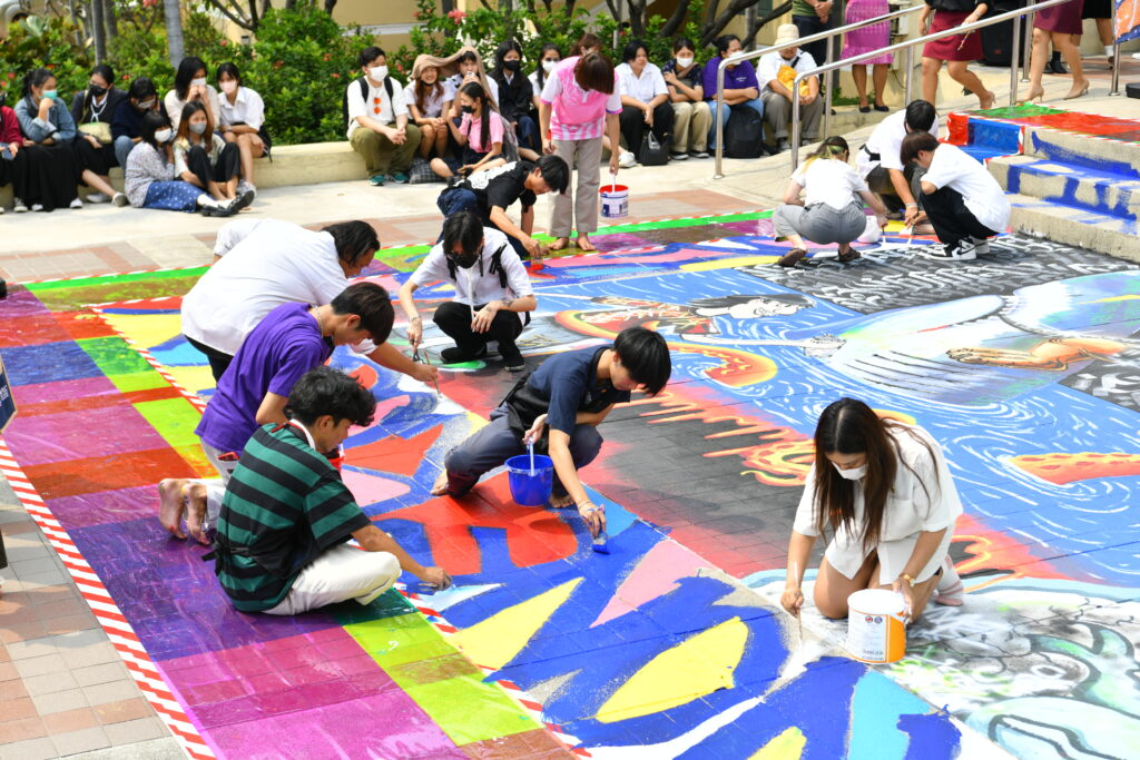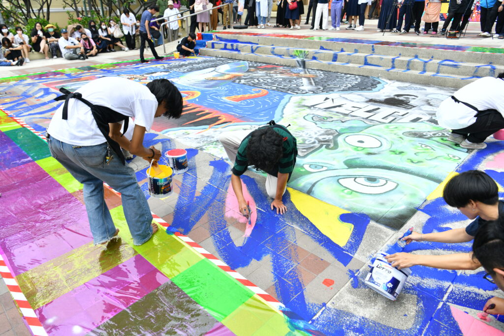 สำหรับ John Andrew Perello หรือที่รู้จักในชื่อ JonOne ศิลปินผลงานกราฟฟิตี้ (Graffiti) ระดับโลก ซึ่ง JonOne ได้อธิบายตัวเองว่าเป็น “จิตรกรกราฟฟิตี้แนวแอ็บสแตร็กชั่นนิสต์” ได้รับแรงบันดาลใจจากผลงานระดับปรมาจารย์อย่าง Miró, Kandinsky, Matisse และนักวาดแนวแอ็บสแตรกต์ชาวอเมริกัน เช่น Pollock, Kooning, Joan Mitchell และ Robert Motherwell การระเบิดของสีอย่างแท้จริง โดยในครั้งนี้ซึ่งเป็นที่แรกที่ JonOne ให้เกียรติมาถ่ายทอดผลงานศิลปะผ่านภาพกราฟฟิตี้บนพื้น บริเวณหน้าคณะศิลปกรรมศาสตร์ ซึ่งนับเป็นเรื่องที่น่ายินดีอย่างยิ่งที่ผลงานดังกล่าวจะถูกกล่าวขานและดำเนินภายใต้ประวัติศาสตร์ไปพร้อม ๆ กับงานศิลปะที่จะเกิดขึ้นที่นี่ต่อ ๆ ไปในอนาคต ตลอดจนยังเป็นผลงานเชิงสัญลักษณ์ที่สามารถสะท้อนถึงแรงบันดาลใจและชีวิตของงานศิลปะให้กับศิลปินรุ่นใหม่ต่อไป