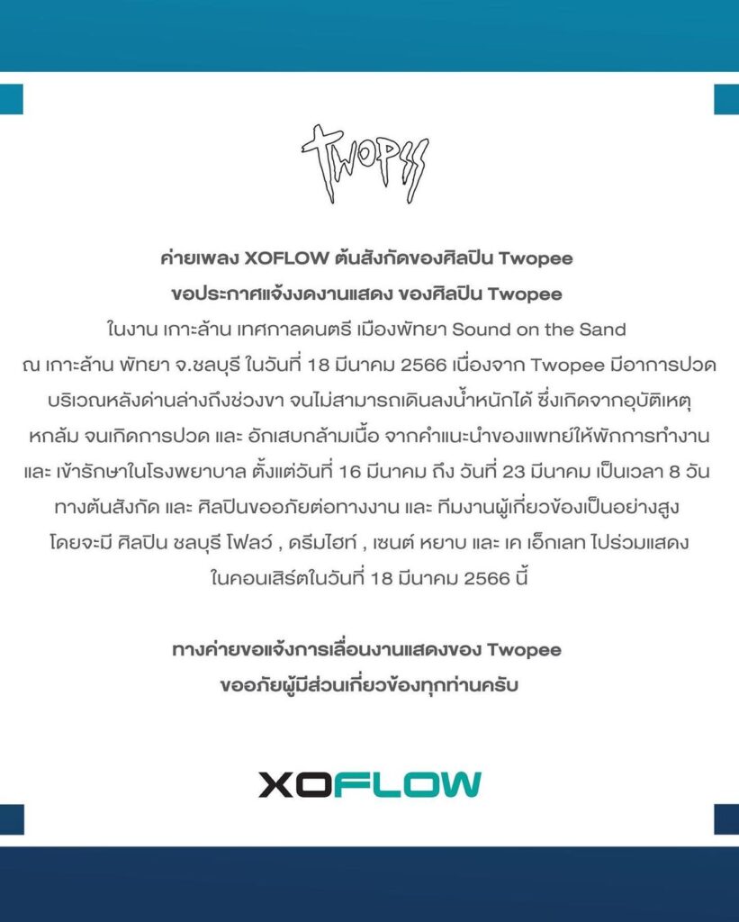 นักร้องหนุ่ม Rapper สุดหล่อ อย่าง โต้ง ทูพี ล่าสุดเข้าโรงพยาบาลแอดมิทด่วน!!! พร้อมกับยกเลิกงานอย่างกระทันหัน โดยโพสต์นี้มีข้อความว่า “ตามระเบียบบบบบ … พัก!!! (พี่ข้างหลังก็ดูอยากจะพัก) ผมและทางวงและทางค่าย ต้องขอโทษทางงาน Pattaya music festival เกาะล้านและแฟนเพลงทุก ๆ คนที่จะเจอกันในวันพรุ้งนี้ด้วยนะครับ เหตุการณ์จากอุบัติเหตุทำให้กระทบหลังช่วงล่าง lower back กระดูกทับเส้นประสาทช่วงกระดูก L3-L4 ทำให้ไม่สามารถเดินและลงน้ำหนักได้อย่างเต็มที่ ขอขอบคุณทางผู้จัดและทางทีม ททท ที่เข้าใจและหวังว่าจะได้เจอกันใหม่นะครับ ปล. ทุก ๆ คนรักษาหน้าหล่อสวยแล้วแล้วอย่าลืมดูแลหลังตัวเองให้ดีดันด้วยนะครับ 2023 plan เลิกแบกอะไรที่มันไม่จำเป็นที่มันหนักเกินกำลังอีกแล้ว be back on the track soon. See yall love”