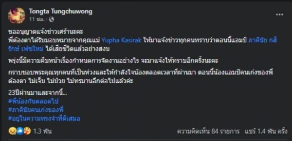 ล่าสุด FB: Tongta Tungchuwong แจ้งว่าเสียชีวิตภายหลังรับการผ่าตัดหัวใจเมื่อเดือนกุมภาพันธ์ 2566 พร้อมกับข้อความสุดซึ้ง “ขออนุญาตแจ้งข่าวเศร้านะคะ พี่ต้องตาได้รับมอบหมายจากคุณแม่ Yupha Kasirak ให้มาแจ้งข่าวทุกคนทราบว่าตอนนี้แอมป์ ภาคินัย กสิรักษ์ เฟซใหม่ ได้เสียชีวิตแล้วอย่างสงบ พรุ่งนี้มีความคืบหน้าเรื่องกำหนดการจัดงานอย่างไร จะมาแจ้งให้ทราบอีกครั้งนะคะ กราบขอบพระคุณทุกคนที่เป็นห่วงและให้กำลังใจน้องตลอดเวลาที่ผ่านมา ตอนนี้น้องแอมป์คนเก่งของพี่ต้องตา ไม่เจ็บ ไม่ป่วย ไม่ทรมานอีกต่อไปแล้วค่ะ 23ปีผ่านมาและจากนี้… #พี่น้องกันตลอดไป #ภาคินัยคนเก่งของพี่ #อยู่ในความทรงจำที่ดีเสมอ”