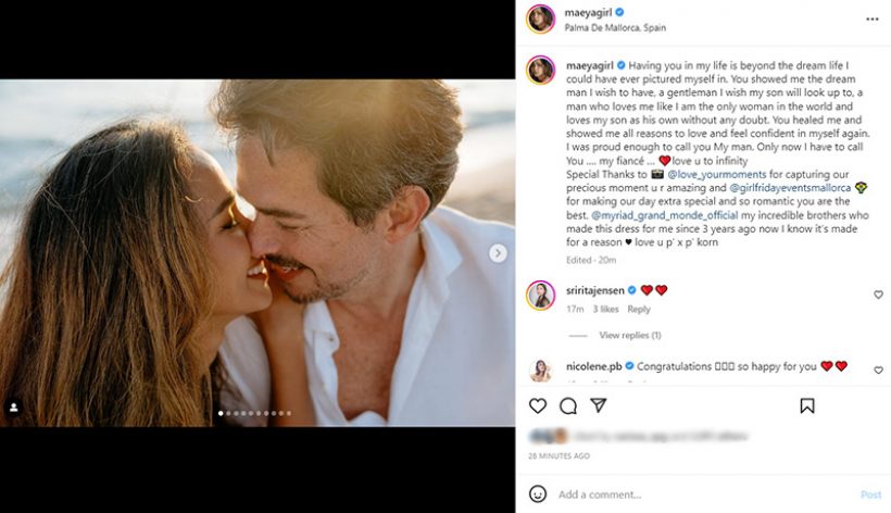 โดย สาวเมญ่า โพสต์ถึงหวานใจสุดหวานไว้ ว่า “Having you in my life is beyond the dream life I could have ever pictured myself in. You showed me the dream man I wish to have,a gentleman I wish my son will look up to, a man who loves me like I am the only woman in the world and loves my son as his own without any doubt.You healed me and showed me all reasons to love and feel confident in myself again. I was proud enough to call you My man. Only now I have to call You …. my fiancé … love u to infinity…” 💓💍🥰
