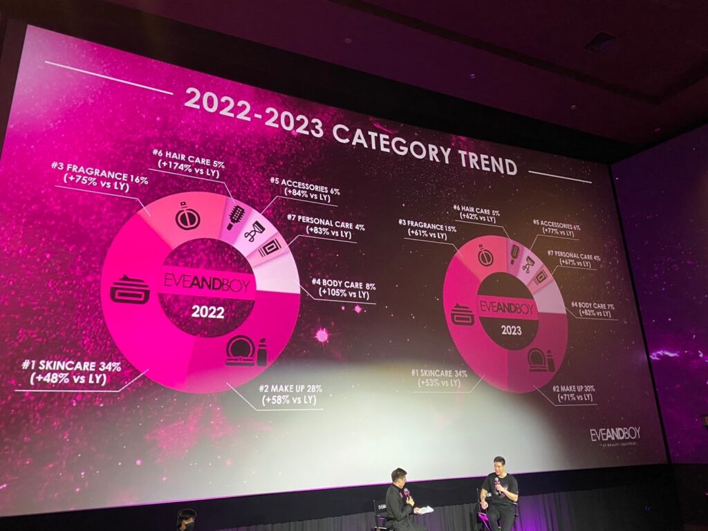 นายหิรัญ ตันมิตร ประธานเจ้าหน้าที่บริหาร บริษัท อีฟแอนด์บอย จำกัด เผยว่า ปีนี้อีฟแอนด์บอย กลับมาคึกคักทั้งในส่วนของแคมเปญ กิจกรรมหน้าร้าน โปรโมชั่น และเปิดรับแบรนด์ชั้นนำเข้ามาร่วมเป็น พาร์ทเนอร์จำนวนมาก ซึ่งยอดขายในปี 2566 นี้ สามเดือนแรกมีตัวเลขที่เติบโตขึ้นมากกว่า60% เมื่อเทียบกับปี 2565 และเมื่อเทียบกับปี 2564 โตขึ้นมากกว่า20% และคาดว่าหลังจากเปิดตัวโกลบอลแอมบาสเดอร์ จะมีทราฟฟิคสูงมากขึ้น สำหรับหมวดหมู่สินค้าที่น่าสนใจ ได้แก่ กลุ่มเมคอัพ สกินแคร์เติบโตอย่างต่อเนื่อง ซึ่งหลังจากสถานการณ์โควิด-19 คลี่คลาย ส่งผลให้กลุ่มเมคอัพกลับมาได้รับความนิยมสูงอีกครั้ง ส่งผลต่อยอดขายโตขึ้นมากกว่า 71% โดยเฉพาะลิปสติกและรองพื้น การผ่อนคลายมาตรการให้ถอดหน้ากากอนามัยได้นั้น เป็นปัจจัยสำคัญที่ทำให้กลุ่มเมคอัพได้รับการตอบรับสูงขึ้นมากและหลายแบรนด์ทยอยออกสินค้าใหม่ส่งผลต่อพฤติกรรมผู้บริโภคกลับมาคึกคัก ในส่วนของสินค้ากลุ่มสกินแคร์ ไม่ว่าจะเป็นกลุ่มของ เวชสำอาง และกลุ่มบอดี้แคร์ เติบโตขึ้นมากกว่า 53% เมื่อเทียบกับปี 2565