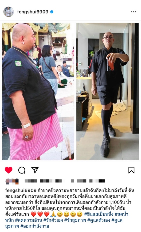 “ถ้าขาดซึ่งความพยายามแล้วฉันก็คงไม่มาถึงวันนี้ ฉันยอมแลกกับเวลานอนตอนตี 3 ของทุกวัน เพื่อตื่นมา แลกกับสุขภาพดีอยากจะบอกว่า สิ่งที่เปลี่ยนไปจากการเดินออกกำลังกาย 1,100 วัน น้ำหนักหายไป 50 กิโลกรัม ขอบคุณทุกคนมากนะที่คอยเป็นกำลังใจให้ฉันตั้งแต่วันแรก ” #ซินแสเป็นหนึ่ง #ลดน้ำหนัก #ลดความอ้วน #รักตัวเอง #รักสุขภาพ #ดูแลตัวเอง #ดูแลสุขภาพ #ออกกำลังกาย