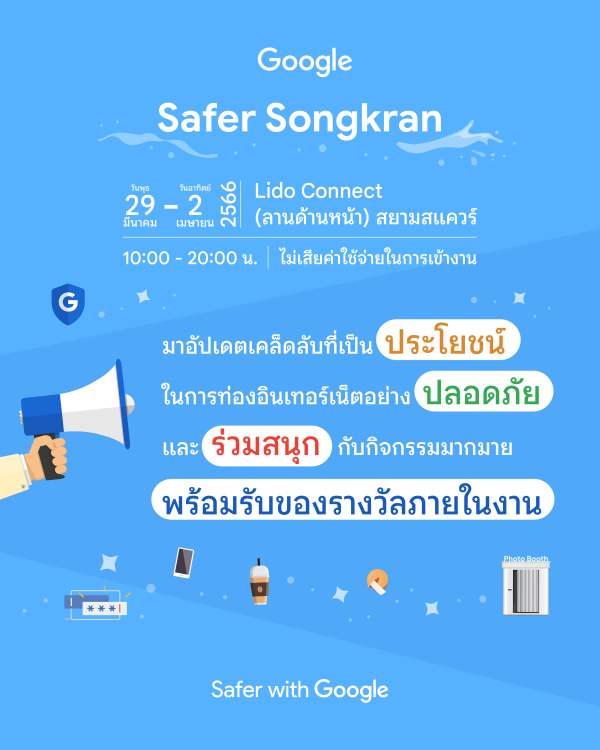 Google ประเทศไทย เดินหน้าสนับสนุนความปลอดภัยบนโลกออนไลน์ จัดป็อปอัพอีเวนต์ “Safer Songkran” ภายใต้โครงการ Safer with Google โดยกิจกรรมพิเศษนี้ Google อยากเชิญชวนให้ทุกท่านมาร่วมสร้างความรู้ความเข้าใจเพื่อความปลอดภัยในโลกดิจิทัล และรับมือกับภัยออนไลน์รูปแบบต่าง ๆ รวมทั้งร่วมกิจกรรมสนุก ๆ ฟรีไม่มีค่าใช้จ่าย อาทิ สร้างสรรค์รูปสวัสดีประจำวันพร้อมเคล็ดลับความปลอดภัยในแบบของตัวเองเพื่อนำไปใช้ส่งต่อในโซเชียลมีเดีย ปรุงพาสเวิร์ดสูตรลับของตนเองกับเครื่องดื่มแก้วพิเศษที่ Safe Tea Cafe และยังมีสิทธิ์ลุ้นรับของรางวัลอีกมากมาย