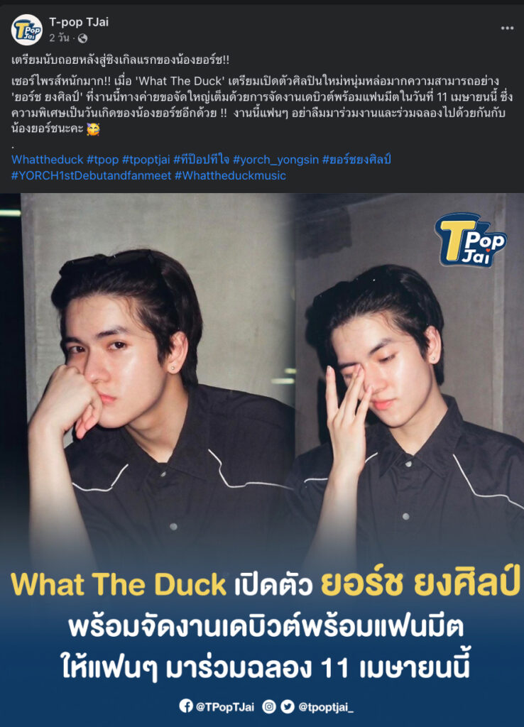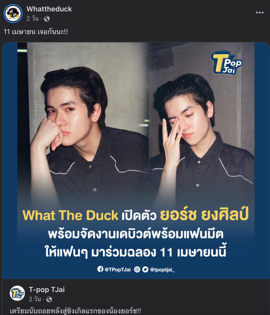 ล่าสุดสังกัดค่ายเพลง What The Duck ได้ประกาศข่าวดี!! เปิดตัวศิลปินน้องใหม่ในค่าย โดยในวันที่ 11 เมษายนนี้เป็นวันเกิดของ น้องยอร์ช จะมีงานเดบิวต์พร้อมจัดงานแฟนมีต “SINGLE DEBUT & FANMEET” ให้เเฟน ๆ ได้มาร่วมสนุกกัน ถือว่าเป็นอีกหนึ่งก้าวความสำเร็จของ หนุ่มยอร์ช หนุ่มหล่อที่มากความสามารถและผลงานอีกด้วย 🥳🥰