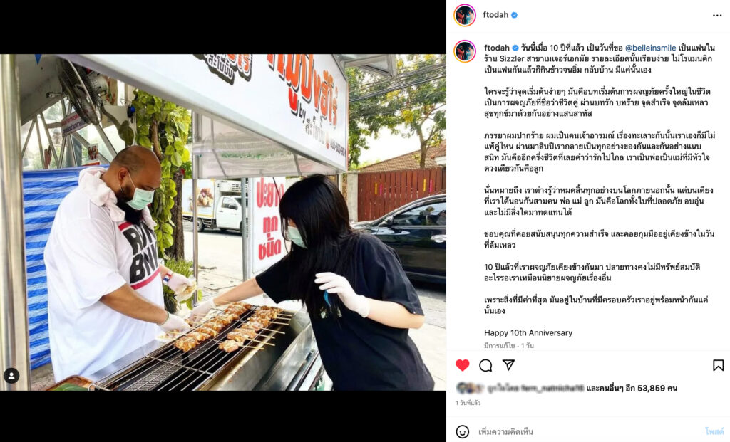 ล่าสุด หนุ่มกอล์ฟ เปิดโหมดสุดซึ้ง ฉลองวันครบรอบ 10 ปีกับภรรยา โดยมีข้อความไว้ว่า “วันนี้เมื่อ 10 ปีที่แล้ว เป็นวันที่ขอ @belleinsmile เป็นแฟนในร้าน Sizzler สาขาเมเจอร์เอกมัย รายละเอียดนั้นเรียบง่าย ไม่โรแมนติก เป็นแฟนกันแล้วก็กินข้าวจนอิ่ม กลับบ้าน มีแค่นั้นเอง
