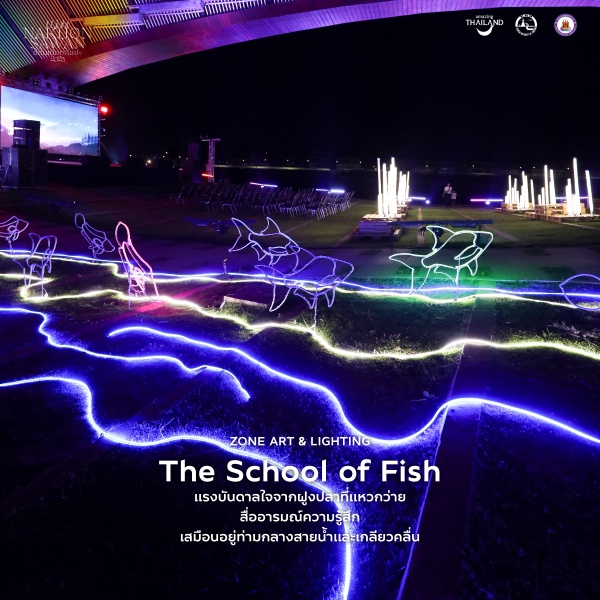 Lighting Design สร้างสรรค์ไฟแอลอีดีเป็นรูปปลาน้อยใหญ่ และเส้นสายริ้วน้ำ ความยาวกว่า 28 เมตร ทอดตัวขนานกับสถาปัตยกรรมของพาสาน ตั้งแสดงโดดเด่นอยู่ตรงบริเวณทางเข้าพื้นที่จัดงาน โดยเป็นผลงานศิลปะที่ได้แรงบันดาลใจจากฝูงปลาที่แหวกว่าย เพื่อสื่ออารมณ์และความรู้สึก เสมือนอยู่ท่ามกลางสายน้ำและเกลียวคลื่น