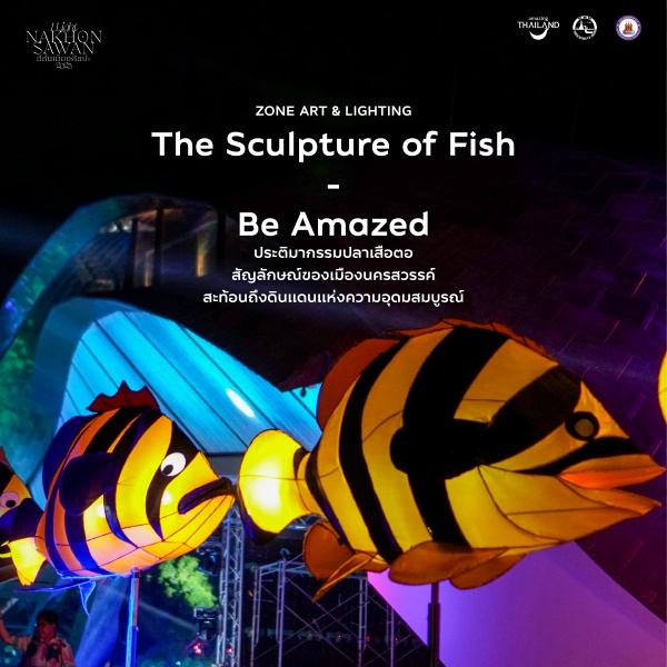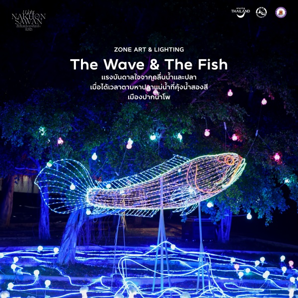 The Wave & The Fishประติมากรรมแบบลอยตัวรูปทรงปลาขนาดใหญ่ ประดับประดาด้วยดวงไฟ อยู่บนลวดลายเส้นสายแอลอีดี โดยแรงบันดาลใจจากคลื่นน้ำและปลา เมื่อได้เวลาตามหาปลาแม่น้ำที่คุ้งน้ำสองสีในเมืองปากน้ำโพ อีกจุดไฮไลท์ที่ตั้งอยู่บริเวณทางเข้าพื้นที่จัดงาน