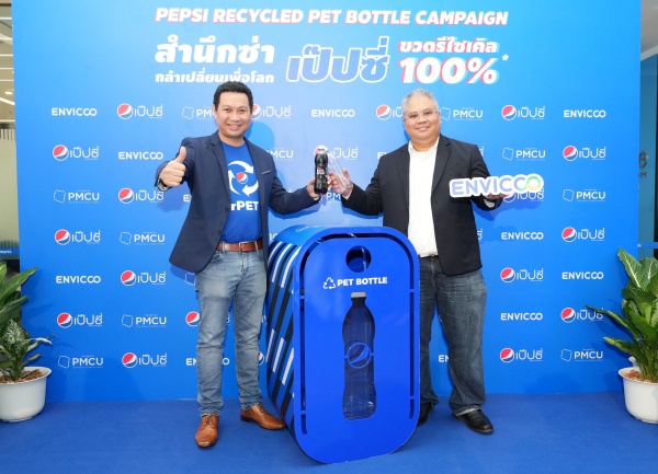 กรุงเทพฯ – เครื่องดื่มเป๊ปซี่ โดยบริษัท ซันโทรี่ เป๊ปซี่โค เบเวอเรจ (ประเทศไทย) จำกัด เดินหน้าปลุกพลังสำนึกรักสิ่งแวดล้อมอย่างยั่งยืน ด้วยการจับมือพันธมิตร สำนักงานจัดการทรัพย์สิน จุฬาลงกรณ์มหาวิทยาลัย (PMCU) และบริษัท เอ็นวิคโค จำกัด จัดงานแถลงข่าว “Pepsi Recycled PET Bottle Campaign” อย่างเป็นทางการ เพื่อประกาศความพร้อมในการใช้ขวดจากพลาสติกรีไซเคิล 100%(ขวด rPET 100%) เป็นเจ้าแรกในตลาดเครื่องดื่มน้ำอัดลม ซึ่งจะวางจำหน่ายภายในเดือนเมษายน 2566 ภายใต้แคมเปญสุดว้าว“สำนึกซ่า กล้าเปลี่ยนเพื่อโลก” ตอกย้ำความเป็นแบรนด์เครื่องดื่มน้ำอัดลมยอดนิยม ที่นำเสนอเทรนด์ใหม่ๆ ให้แก่ผู้บริโภคอย่างต่อเนื่อง และส่งเสริมภาพลักษณ์แบรนด์สุดซ่าขวัญใจวัยรุ่นที่ใส่ใจสิ่งแวดล้อม โดยเตรียมออกสตาร์ทโมเม้นท์สำคัญครั้งแรกร่วมกับ PMCU ติดตั้งถังขยะดีไซน์พิเศษสำหรับใส่ขวด PET ทั่วบริเวณสยาม สแควร์ ตั้งแต่ช่วงสงกรานต์นี้ – ธันวาคม 2566 และผนึกกำลังกับเอ็นวิคโค ผู้ผลิตเม็ด rPET ที่ได้มาตรฐานสากลและผ่านการรับรองจากสำนักงานคณะกรรมการอาหารและยา (อย.) ประเทศไทย เป็นเจ้าแรก ส่งเสริม Bottle-to-Bottle Recycling มุ่งสู่เศรษฐกิจหมุนเวียน