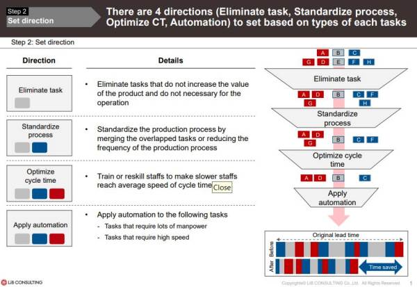 - Direction setting ออกแบบและกำหนดแนวทางในการปรับปรุง Workflow ให้กระบวนการทำงานขององค์กรมีประสิทธิภาพมากขึ้น ซึ่งจุดสำคัญ คือ การคิดจากผลลัพธ์ที่จะได้ว่าสร้าง Value มากแค่ไหนให้กับธุรกิจบ้าง และ Impact ของการลด Output แต่ละส่วนไปจะส่งผลมากน้อยเพียงใดกับธุรกิจ