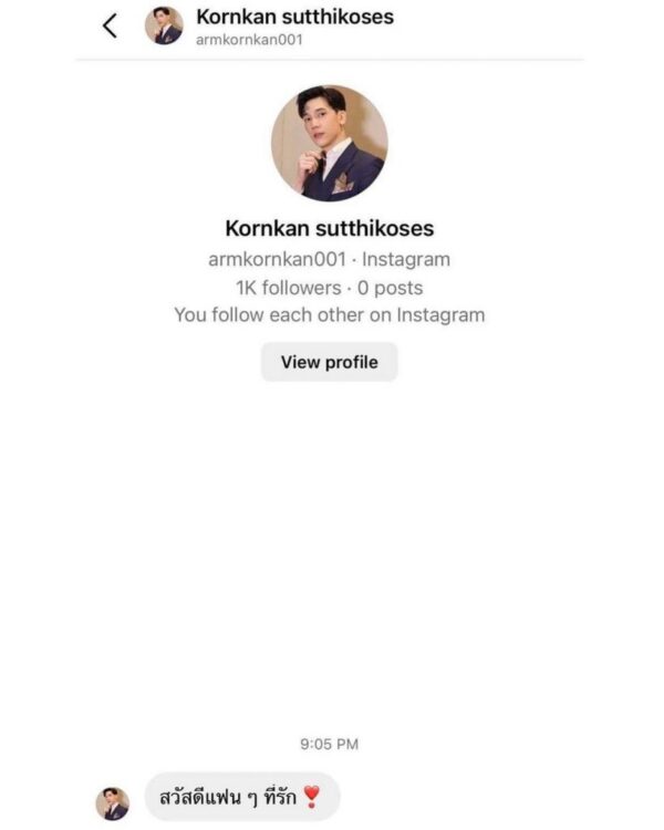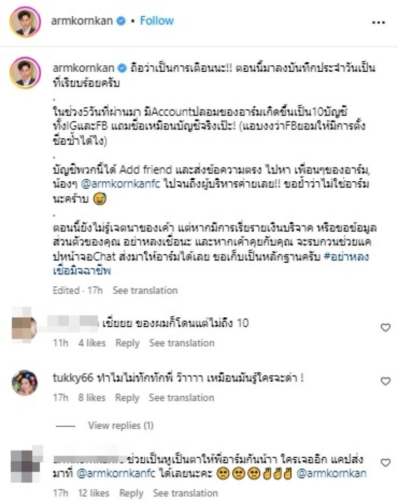 โดย หนุ่มอาร์ม โพสต์ไว้ว่า “ถือว่าเป็นการเตือนนะ!! ตอนนี้มาลงบันทึกประจำวันเป็นที่เรียบร้อยครับ ในช่วง5วันที่ผ่านมา มี Account ปลอมของอาร์มเกิดขึ้นเป็น10บัญชี ทั้งIGและFB แถมชื่อเหมือนบัญชีจริงเป๊ะ! (แอบงงว่าFBยอมให้มีการตั้งชื่อซ้ำได้ไง) บัญชีพวกนี้ได้ Add friend และส่งข้อความตรง ไปหา เพื่อน ๆ ของอาร์ม, น้อง ๆ @armkornkanfc ไปจนถึงผู้บริหารค่ายเลย!! ขอย้ำว่าไม่ใช่อาร์มนะคร้าบ ตอนนี้ยังไม่รู้เจตนาของเค้า แต่หากมีการเรี่ยรายเงินบริจาค หรือขอข้อมูลส่วนตัวของคุณ อย่าหลงเชื่อนะ และหากเค้าคุยกับคุณ จะรบกวนช่วยแคปหน้าจอChat ส่งมาให้อาร์มได้เลย ขอเก็บเป็นหลักฐานครับ #อย่าหลงเชื่อมิจฉาชีพ”