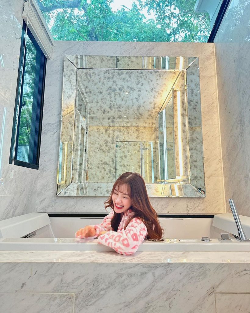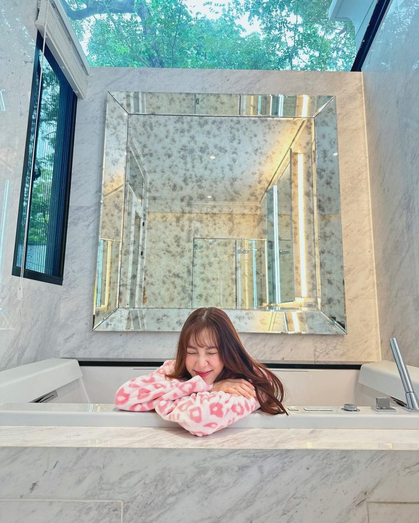 ล่าสุด สาวใบเฟิร์น ได้เผยให้เห็นอีกมุมสุดประทับใจ คือบริเวณห้องน้ำที่มีอ่างอาบน้ำพร้อมวิวที่มีต้นไม้ล้อมรอบ บอกเลยว่า หรูหรา อลังการมาก ๆ