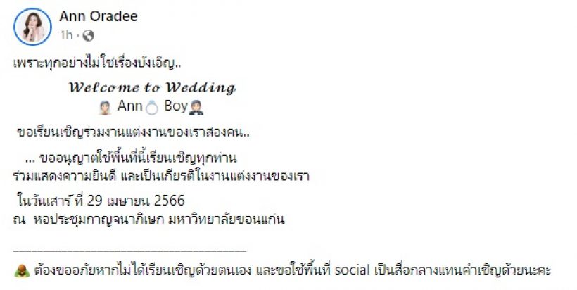 โดย สาวแอน โพสต์ภาพคู่ในชุดแต่งงาน พร้อมข้อความไว้ว่า “เพราะทุกอย่างไม่ใช่เรื่องบังเอิญ…Welcome to Wedding Ann Boy ขอเรียนเชิญร่วมงานแต่งงานของเราสองคน ขออนุญาตใช้พื้นที่นี้เรียนเชิญทุกท่านร่วมแสดงความยินดี และเป็นเกียรติในงานแต่งงานของเรา ในวันเสาร์ที่ 29 เมษายน 2566 ณ หอประชุมกาญจนาภิเษก มหาวิทยาลัยขอนแก่น”