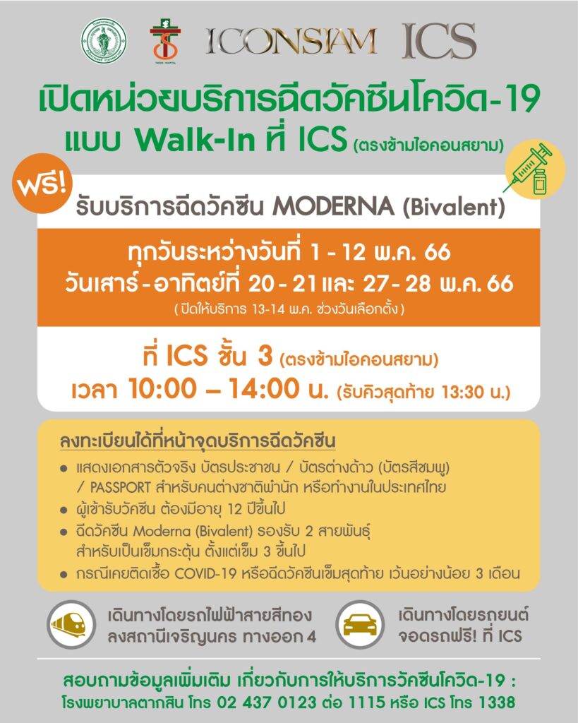 ไอคอนสยาม และ ไอซีเอส ร่วมกับกรุงเทพมหานคร โดยโรงพยาบาลตากสิน สำนักการแพทย์ กทม. เปิดหน่วยบริการฉีดวัคซีนโควิด-19 แก่ประชาชนทั่วไป แบบ Walk in ให้บริการฉีดวัคซีน Moderna (Bivalent) เข็มกระตุ้นตั้งแต่เข็มที่ 3 เป็นต้นไป รองรับ 2 สายพันธุ์ สำหรับผู้มีอายุ 12 ปีขึ้นไป ฟรี! (ไม่มีค่าใช้จ่าย) เพื่ออำนวยความสะดวกแก่ประชาชนด้วยประสิทธิภาพการบริหารจัดการและมาตรฐานความปลอดภัยสูงสุด ณ ICS ไลฟ์สไตล์ คอมเพล็กซ์ (ตรงข้าม ICONSIAM)