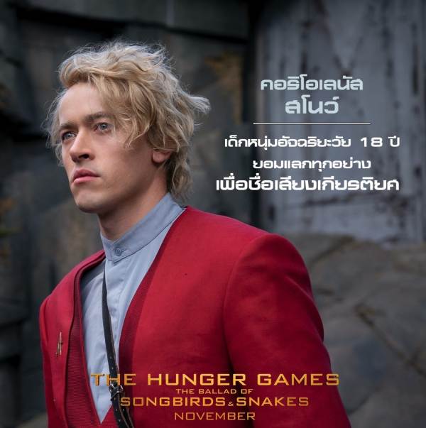 “คอริโอลานุส สโนว์” เด็กหนุ่มอัจฉริยะวัย 18 ปี ที่ยอมแลกทุกอย่างเพื่อชื่อเสียงและเกียรติยศ รับบทโดย “ทอม บลายธ์” (Billy The Kid, The Gilded Age) ชายหนุ่มผู้มีความคล้ายคลึงกับ โดนัลด์ ซูเธอร์แลนด์ ผู้รับบทประธานาธิบดีสโนว์ในไตรภาคต้นฉบับ ฟรานซิส ลอเรนซ์ ผู้กำกับกล่าว