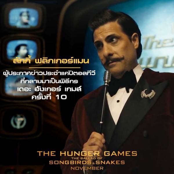 “ลักกี้ ฟลิกเกอร์แมน” ผู้ประกาศข่าวประจำแคปิตอลทีวี ที่กลายมาเป็นพิธีกรเดอะ ฮังเกอร์ เกมส์ ครั้งที่ 10 รับบทโดย “เจสัน ชวาตซ์แมน” (The Grand Budapest Hotel, The French Dispatch)