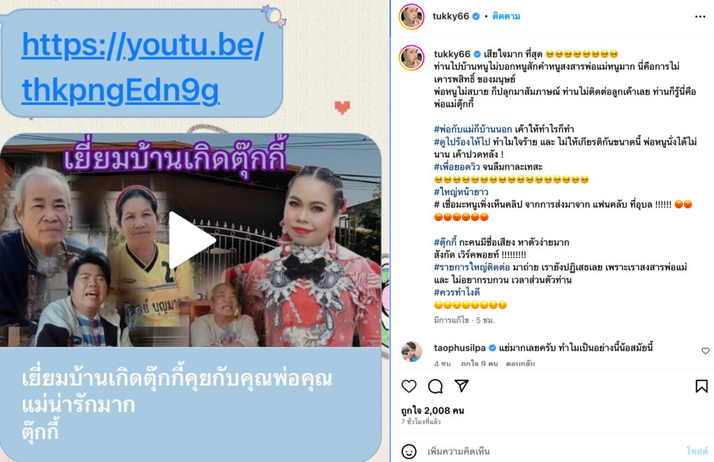 “เสียใจมาก ที่สุด ท่านไปบ้านหนูไม่บอกหนูสักคำหนูสงสารพ่อแม่หนูมาก นี่คือการไม่เคารพสิทธิ์ ของมนุษย์ พ่อหนูไม่สบาย ก็ปลุกมาสัมภาษณ์ ท่านไม่ติดต่อลูกเค้าเลย ท่านก็รู้นี่คือพ่อแม่ตุ๊กกี้ #พ่อกับแม่ก็บ้านนอก เค้าให้ทำไรก็ทำ #ดูไปร้องไห้ไป ทำไมใจร้าย และ ไม่ให้เกียรติกันขนาดนี้ พ่อหนูนั่งได้ไม่นาน เค้าปวดหลัง! #เพื่อยอดวิว จนลืมกาละเทศะ #ใหญ่หน้ายาว #เชื่อมะหนูเพิ่งเห็นคลิป จากการส่งมาจากแฟนคลับที่อุบล!!!”