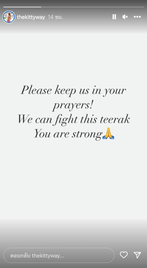 ส่วนทางด้านภรรยาได้เขียนข้อความให้กำลังใจสามีผ่านไอจีสตอรี่ไว้ว่า “Please keep us in your prayers! We can fight this teerak. You are strong”