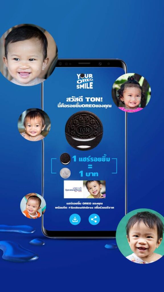 แฟน ๆ ทั่วประเทศสามารถมาร่วมสร้างอีโมจิรอยยิ้มกับโอรีโอได้ง่าย ๆ เพียงสแกนคิวอาร์โค้ดที่ปรากฏอยู่บนซองคุกกี้โอรีโอหรือเข้าไปที่เว็บไซต์ www.YourOreoSmile.com และคลิกไปที่ Let’s Smile จากนั้นแชะภาพรอยยิ้มที่บ่งบอกความเป็นตัวตนของคุณด้วยรอยยิ้มที่เป็นเอกลักษณ์ พร้อมพิมพ์ชื่อสุดครีเอทลงบนคุกกี้ โดยในขั้นตอนนี้ อีโมจิรอยยิ้มคุกกี้โอรีโอในแบบของคุณที่สร้างสรรค์ด้วยเทคโนโลยี AI สุดล้ำก็จะปรากฏขึ้น พร้อมให้ผู้ร่วมกิจกรรมได้แชร์ความสนุกกับเพื่อน ๆ และครอบครัวผ่านเฟซบุ๊คหรืออินสตาแกรม ไม่ว่าจะเป็นการโพสต์ลงบนหน้าฟีดหรือแชร์ผ่านการลงสตอรี่ (Story) ซึ่งทุกการแชร์จะมีมูลค่าเท่ากับเงินบริจาค 1 บาท โดยโอรีโอขอเชิญชวนให้ผู้บริโภคชาวไทยทุกคนมาร่วมแบ่งปันรอยยิ้มในแคมเปญ #SmilewithOreo เพื่อเป็นส่วนหนึ่งในการสนับสนุนยอดบริจาคสูงสุด 200,000 บาท แก่มูลนิธิสร้างรอยยิ้ม ซึ่งจะนำเงินบริจาคที่ได้ไปใช้ในการสนับสนุนค่าใช้จ่ายในการรักษาผ่าตัดแก่ผู้ป่วยยากไร้ที่มีภาวะปากแหว่งเพดานโหว่ รวมถึงแผลไฟไหม้ และความผิดปกติอื่น ๆ บนใบหน้า