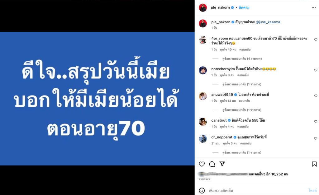 ล่าสุด เปิ้ล นาคร โพสต์ข้อความด้วยความดีใจ เมื่อ จูน กษมา อนุญาตให้มีเมียน้อยได้แล้ว โดยมีข้อความโพสต์ไว้ว่า “ดีใจ…สรุปวันนี้เมียบอกให้มีเมียน้อยได้ ตอนอายุ 70” พร้อมเขียนแคปชั่นกำกับย้ำไว้ “สัญญาแล้วนะ @june_kasama” เรื่องราวจะเป็นยังไงกันน๊าาาา อิอิ