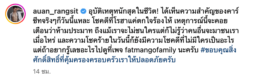 “เรียบร้อยนะครับ เหตุเกิดที่หัวหินนะครับ มีรถชนท้ายนะครับเต็ม ๆ เลย เนื่องจากว่ารถติดไฟแดงเราก็จอดอยู่ แต่ว่ารถเขาเบรกไม่ทันนะครับ โชคไม่ดีเลยครับที่เกิดเหตุการณ์แบบนี้ แต่ยังดีนะครับที่ทุกคนไม่เป็นอะไรมาก ทุกคนปลอดภัย นี่คือสิ่งที๋โชคดีนะครับ ถึงแม้ว่าจะโชคไม่ดีที่รถพังไปแล้วนะครับ คุณแม่เจ็บหนักที่สุด เพราะชนแรงมาก ส่วนโรฮาโชคดีมากที่นั่งคาร์ซีทอยู่ โชคดีที่สุดคือโรฮาไม่เป็นอะไร”