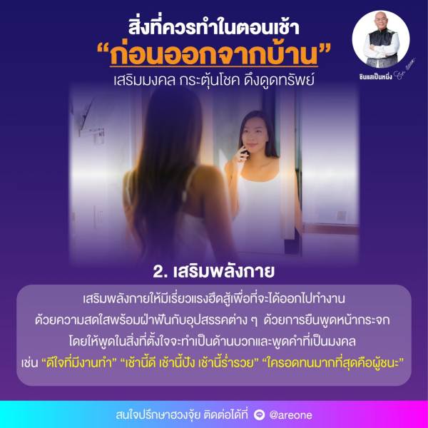 เสริมพลังกายให้มีเรี่ยวแรงฮึดสู้เพื่อที่จะได้ออกไปทำงานด้วยความสดใสพร้อมฝ่าฟันกับอุปสรรคต่าง ๆ ด้วยการยืนพูดหน้ากระจก โดยให้พูดในสิ่งที่ตั้งใจจะทำเป็นด้านบวกและพูดคำที่เป็นมงคล เช่น “ดีใจที่มีงานทำ” “เช้านี้ดี เช้านี้ปัง เช้านี้ร่ำรวย” “ใครอดทนมากที่สุดคือผู้ชนะ”
