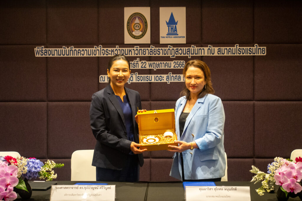 รองศาสตราจารย์ ดร.ชุติกาญจน์ ศรีวิบูลย์ อธิการบดีมหาวิทยาลัยราชภัฏสวนสุนันทา เปิดเผยว่า “สำหรับการจับมือร่วมกันของมหาวิทยาลัยราชภัฏสวนสุนันทา สมาคมโรงแรมไทย และโรงแรมเดอะ สุโกศล กรุงเทพ ในครั้งนี้ เรามีเป้าหมายเดียวกันคือ ร่วมกันพัฒนาหลักสูตรและการจัดการเรียนการสอนด้านการโรงแรมและธุรกิจที่พัก หลักสูตรฝึกอบรมระยะสั้นต่าง ๆ และการฝึกประสบการวิชาชีพของนักศึกษา และร่วมกันส่งเสริมพัฒนานักศึกษาและบุคลากรให้มีความรู้ ความความสามารถและมีมาตรฐานด้านธุรกิจให้บริการโรงแรมและที่พักแบบครบวงจร อีกทั้งเพื่อร่วมกันพัฒนาและสนับสนุนการบริการวิชาการด้านการโรงแรมและธุรกิจที่พัก อีกด้วย โดยมหาวิทยาลัยจัดส่งอาจารย์และนักศึกษาเข้าพัฒนาความเชี่ยวชาญในทักษะวิชาชีพโดยเรียนรู้ทั้งภาคทฤษฎีและปฏิบัติเพื่อให้ได้เรียนรู้ประสบการณ์การทำงานจริงอันจะเป็นประโยชน์กับคณาจารย์และนักศึกษาในอนาคต ภายใต้ข้อตกลงร่วมกัน เพื่อผลิตบัณฑิตและบุคลากรที่มีมาตรฐานสู่ธุรกิจบริการของประเทศต่อไป”