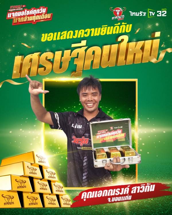 เชิญชวนทุกคนร่วมสนุกกับโปรโมชั่น “บาวแดงช่วยคนไทยสร้างอาชีพ ปี 2 แจกมอไซค์ทุกวัน แจกล้าน ทุกเดือน” แจกรถจักรยานยนต์ทุกวัน 100 วัน 100 คัน กติกาง่ายๆ เพียง 3 ขั้นตอน เขียน บีบ ส่ง ฝา คาราบาวแดง เขียนคำว่า “วิตามินบี 12” หรือฝาคันโซคูณสอง เขียนคำว่า “ตับ” ตามด้วยชื่อ นามสกุล และเบอร์โทรศัพท์ เขียนด้วยลายมือเท่านั้น บีบใส่ฝา ส่งฝาที่กล่องคาราบาวแดง ได้ที่ร้าน CJ MORE, ร้านถูกดี มีมาตรฐาน และร้านค้าที่ร่วมรายการ หรือส่งตู้ ปณ.2 บางปะกง ฉะเชิงเทรา 24130 ตั้งแต่วันนี้ – 31 กรกฎาคม 2566 ยิ่งส่งมาก ยิ่งมีสิทธิ์มาก ประกาศผู้โชคดีทุกวัน ทางรายการตะลอนข่าว 9.30 น. โดยกำหนดการจับทองล้านครั้งถัดไป คือวันที่ 1 กรกฎาคม 2566 และจับรางวัลทองล้านสุดท้ายในวันที่ 5 สิงหาคม 2566