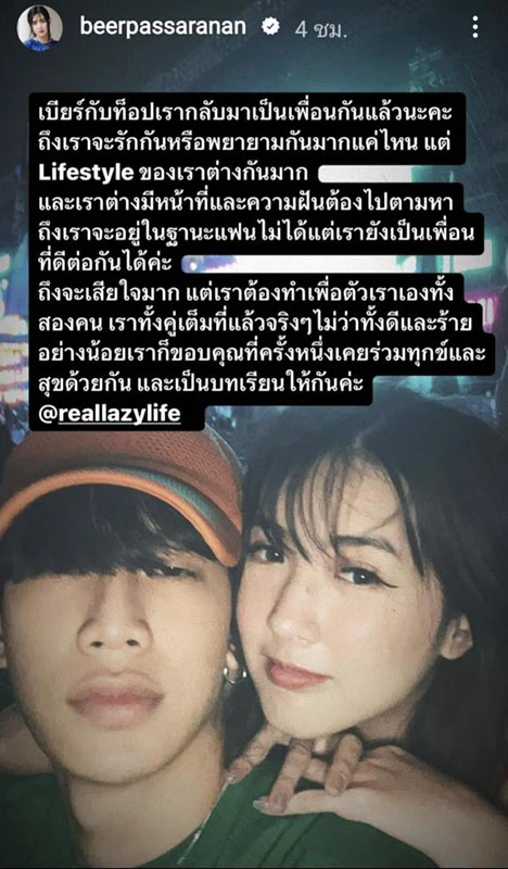 แต่ล่าสุดความรักของทั้งสอง ได้ปิดฉากรักลงแล้ว โดย สาวเบียร์ เป็นฝ่ายประกาศเลิก มีข้อความไว้ว่า “เบียร์กับท็อปเรากลับมาเป็นเพื่อนกันแล้วนะคะ ถึงเราจะรักกันหรือพยายามกันมากแค่ไหน แต่ Lifestyle ของเราต่างกันมาก และเราต่างมีหน้าที่และความฝันต้องไปตามหา ถึงเราจะอยู่ในฐานะแฟนไม่ได้แต่เรายังเป็นเพื่อนที่ดีต่อกันได้ค่ะถึงจะเสียใจมาก แต่เราต้องทำเพื่อตัวเราเองทั้งสองคน เราทั้งคู่เต็มที่แล้วจริง ๆ ไม่ว่าทั้งดีและร้ายอย่างน้อยเราก็ขอบคุณที่ครั้งหนึ่งเคยร่วมทุกข์และสุขด้วยกัน และเป็นบทเรียนให้กันค่ะ @reallazylife”
