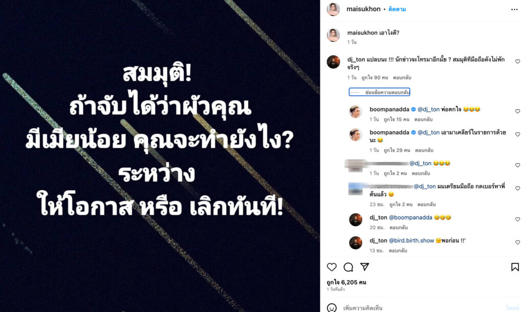 ส่วนทางสามี อย่าง ดีเจต้น สรพงษ์ จิตต์สุนทร รีบเข้ามาเมนต์ เพื่อสยบความเข้าใจผิดฃไม่ให้คิดไปไกลไว้ว่า “แป๊บนะ !!! นักข่าวจะโทรมาอีกมั้ย ? สมมติทีมือถือดังไม่พักจริง ๆ “😂