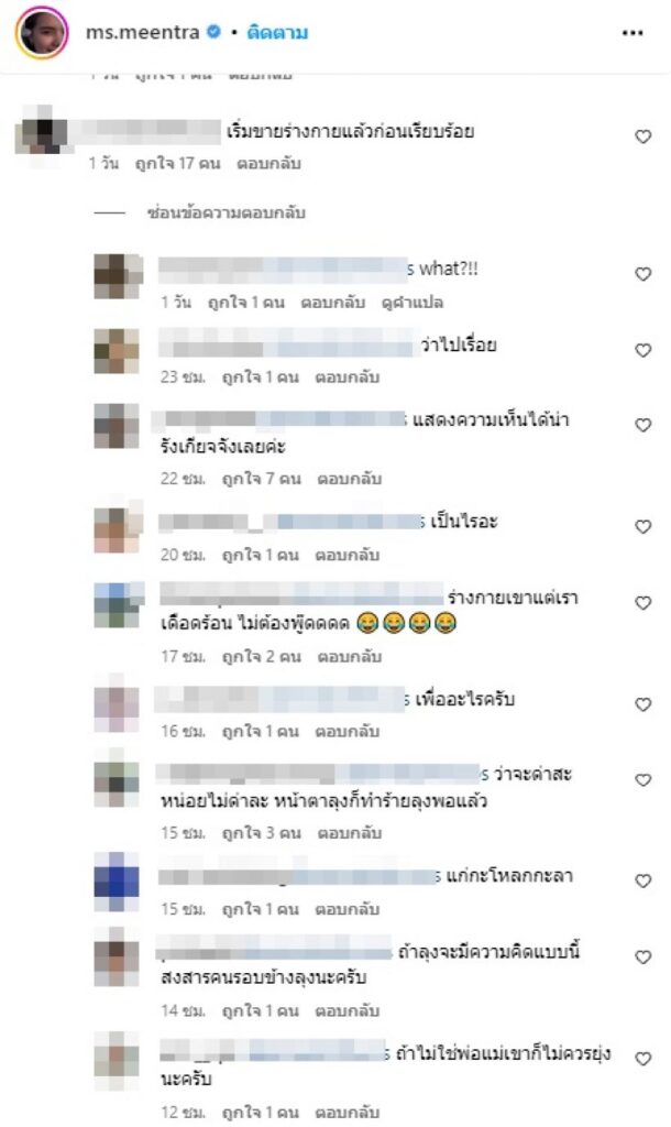 ล่าสุด สาวมีนตรา มาในชุดสุดแซ่บ โดยแฟน ๆ ก็ต่างชมและว้าวกับความสวย ความแซ่บของเธอ แต่!! ดันมีชาวเน็ตคอมเมนต์แซะอย่างแรงไว้ว่า “เริ่มขายร่างกายแล้วก่อนเรียบร้อย”