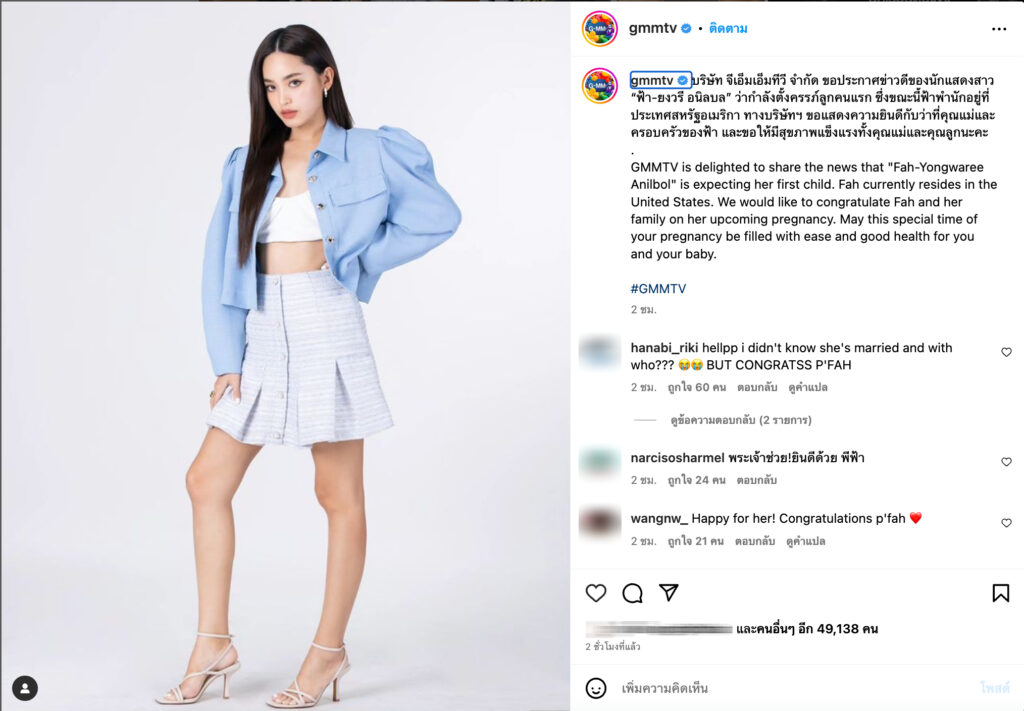 โดยทางต้นสังกัดโพสต์ดังกล่าวมีเนื้อหาใจความว่า “บริษัท จีเอ็มเอ็มทีวี จำกัด ขอประกาศข่าวดีของนักแสดงสาว “ฟ้า-ยงวรี อนิลบล” ว่ากำลังตั้งครรภ์ลูกคนแรก ซึ่งขณะนี้ฟ้าพำนักอยู่ที่ประเทศสหรัฐอเมริกา ทางบริษัทฯ ขอแสดงความยินดีกับว่าที่คุณแม่และครอบครัวของฟ้า และขอให้มีสุขภาพแข็งแรงทั้งคุณแม่และคุณลูกนะคะ”