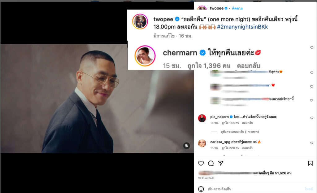 และล่าสุด! หนุ่มโต้ง โพสต์คโมทซิงเกิ้ลใหม่ “ขออีกคืน” โดยมีแคปชั่นไว้ว่า “ขออีกคืน (one more night) ขออีกคืนเดียว พรุ่งนึ้ 18.00pm ละเจอกัน” หลังจากนั้น สาวพลอย ก็ได้ตอบไปตัวแม่จะแคร์เพื่อไว้ว่า “ให้ทุกคืนเลยค่ะ”