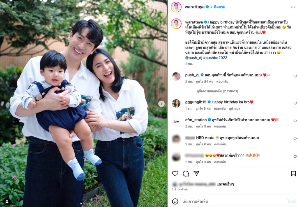 สำหรับคู่รักที่ขึ้นแท่นเป็นคุณพ่อคุณแม่ป้ายแดง อย่าง จุ๋ย วรัทยา และ พุฒ พุฒิชัย ที่มาพร้อมกับลูกชายสุดน่ารัก อย่าง น้องพีร์เจ เข้ามาเติมเต็มครอบครัวให้สมบูรณ์ ด้วยความน่ารัก น่าฟัดทำเอาพี่ ๆ หลายคนต่างกันตกหลุมรัก น้องพีร์เจ กันเป็นแถว ซึ่งเราสามารถติดตาโมเมนต์น่ารัก ๆ ของครอบครัว พ่อพุฒแม่จุ๋ย ได้ที่ warattaya,push_dj