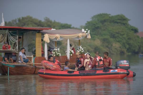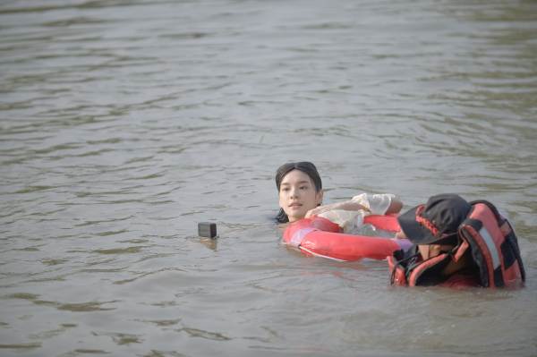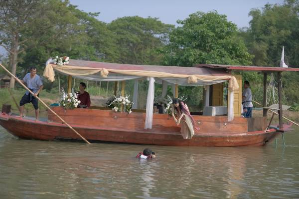 และอีกหนึ่งความยากของการถ่ายทำในครั้งนี้คือทีมงานและนักแสดงทุกคนต้องลงไปอยู่ในเรือแล่นไปกลางแม่น้ำจริงตลอดการถ่ายทำ พ่ออี๊ด จึงได้เรียกเฌอปราง BNK48 และ ภัทร นัตธนนท์ ปิ่นโรจน์กีรติ ที่รับบทนพ พี่ชายของลำจวน มาซ้อมคิวอย่างละเอียดยิบให้แม่นยำ ด้านพี่ชายสบาย ๆ ชิล ๆ เพราะไม่ต้องกระโดดน้ำ ต่างจากเฌอปรางBNK48 ที่ถึงจะเตรียมใจมาบ้างแล้ว แต่พอเห็นจุดที่ตัวเองต้องกระโดดลงแม่น้ำจริง ๆ ก็แอบสั่น ๆ อยู่ไม่น้อย แต่งานนี้ไม่ต้องห่วง เพราะพ่ออี๊ด จัดเซฟตี้ไว้อย่างดี มีพี่ ๆ ทีมงานคอยดูอยู่ในน้ำใกล้ๆ เฌอปรางBNK48 เลยอุ่นใจสู้ไม่ถอย หลังจากเตรียมใจพร้อมแล้วก็ให้สัญญาณลุยถ่ายจริงทันที เริ่มที่ เฌอปราง ต้องร้องไห้กอดกันร่ำลากับแม่จำปา(ลูกหว้า พิจิกา) แล้วลงไปนั่งในเรือส่งตัวเจ้าสาวกับพี่ชาย ซึ่งตัวเองคิดไว้แล้วว่าระหว่างทางจะต้องหนี พอสบโอกาสที่ทุกคนเผลอก็กระโดดจากเรือลงแม่น้ำ แล้วแกล้งจมน้ำ ดำน้ำหนีหายไปทันที ซึ่งตอนถ่ายทำเฌอปรางBNK48 ทำได้สมบูรณ์แบบมาก คือเล่นครั้งเดียวผ่าน ผู้กำกับได้ภาพอย่างที่ต้องการก็สั่งคัทเช็คเทปทันที ทำเอาทีมงานที่ยืนลุ้นกันอยู่ปรบมือให้กับสปิริตของนางเอกกันเกรียวกราว แล้วรีบโยนห่วงยางให้และพาขึ้นกลับขึ้นเรือทันที