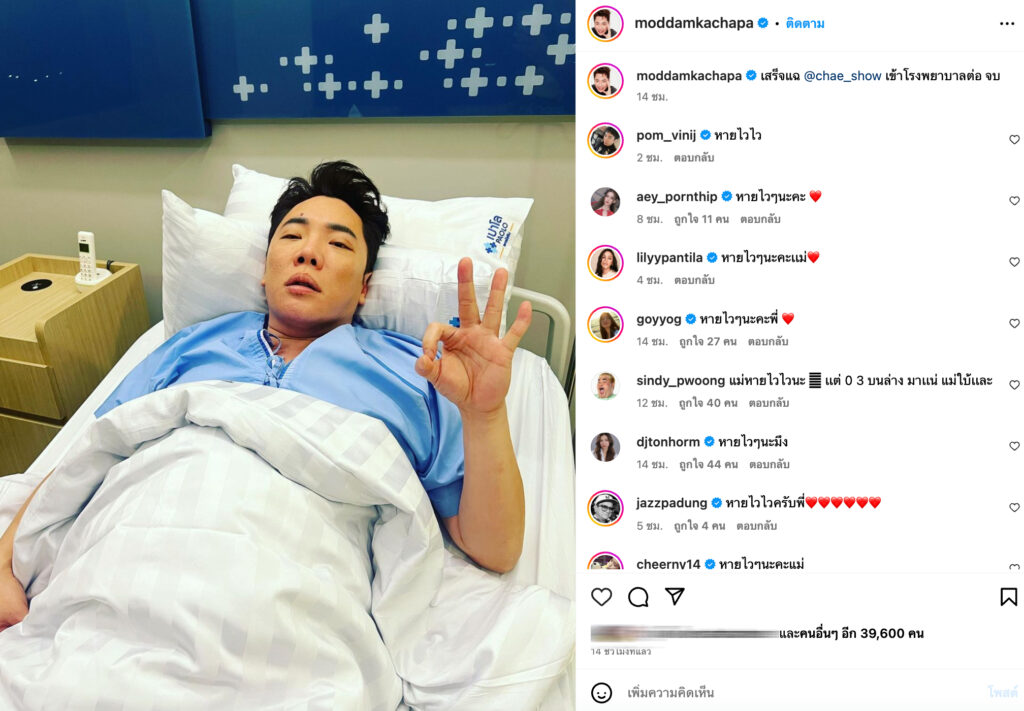 ล่าสุด มดดำ โพสต์ภาพขณะกำลังนอนอยู่บนเตียง พร้อมแคปชั่นสั้น ๆ ไว้ว่า “เสร็จแฉ @chae_show เข้าโรงพยาบาลต่อ จบ” ท่ามกลางเหล่าเพื่อน ๆ และแฟนคลับส่งกำลังใจอย่างล้นหลาม❤️