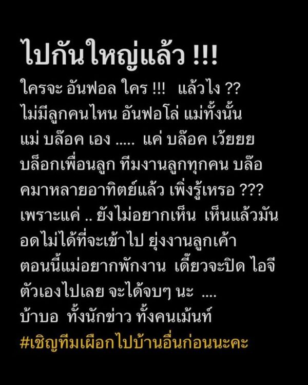 หลังมีประเด็นดราม่าเรื่องอัลฟอลโลไอจีกัน ล่าสุด เเม่หมู พิมพ์ผกา เคลื่อนไหวพร้อมโพสต์ฟาดกลางไอจี ไว้ว่า “ไปกันใหญ่แล้ว !!! ใครจะ อันฟอล ใคร !!! แล้วไง ?? ไม่มีลูกคนไหน อันฟอโล่ แม่ทั้งนั้น แม่ บล๊อค เอง. แค่ บล๊อค เว้ยยย บล็อกเพื่อนลูก ทีมงานลูกทุกคน บล๊อคมาหลายอาทิตย์แล้ว เพิ่งรู้เหรอ ??? เพราะแค่ .. ยังไม่อยากเห็น เห็นแล้วมันอดไม่ได้ที่จะเข้าไป ยุ่งงานลูกเค้า