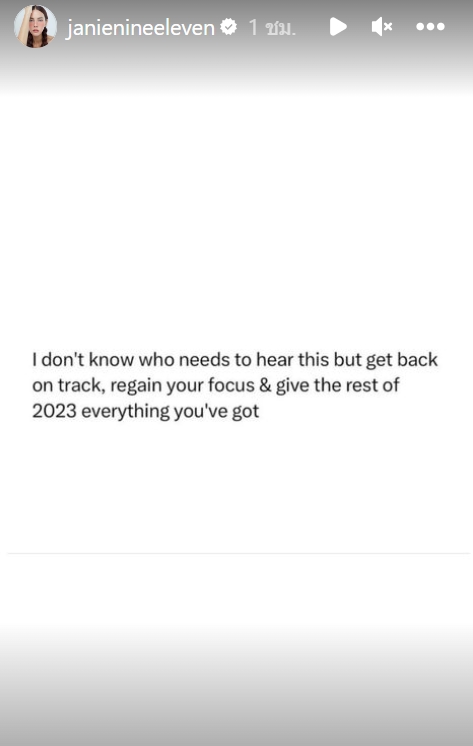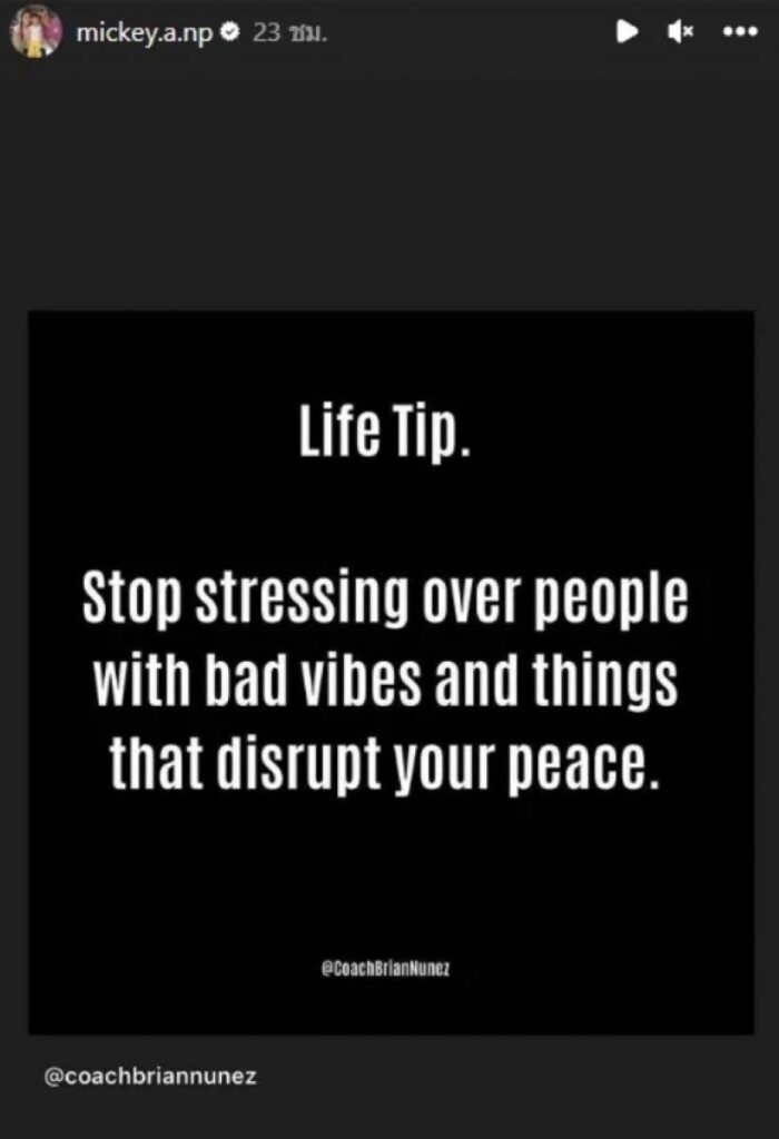 โดย สาวเจนี่  โพสต์ข้อความลงไอจีสตอรี่ไว้ว่า “I don’t know who needs to hear this but get back on track regain your focus & give the rest of 2023 everything you’ve got” และทางด้าน หนุ่มมิกกี้ ก็ได้โพสต์ข้อความลงไอจีสตอรี่อีกเช่นกัน “life tip stop stressing over people with bad vibes and things that disrupt your peace.”