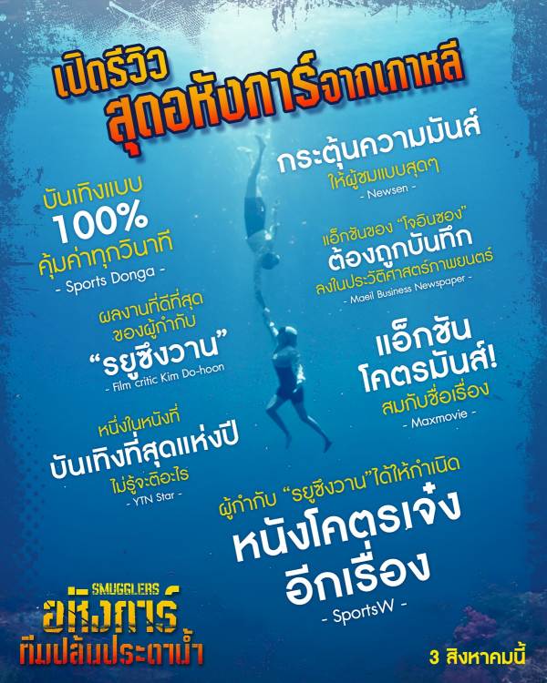 พร้อมนับถอยหลังสู่ความระทึก กับขบวนการปล้นประดาน้ำ ที่พวกเขาจะมาเปลี่ยนหมู่บ้านบนเกาะเชจูอันสงบสุขให้กลายเป็นแหล่งกบดานของการก่ออาชญากรรมวงการสีเทา ถึงเวลาที่เราแฟนหนังชาวไทย เตรียมออกไปพิสูจน์ความเดือดดาน สะท้านความระห่ำ กับ Smugglers อหังการ์ทีมปล้นประดาน้ำ 3 สิงหาคมนี้ ในโรงภาพยนตร์
