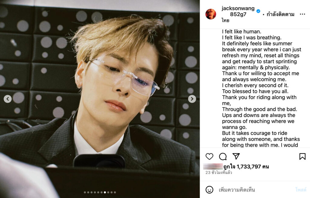 อย่างล่าสุด หนุ่มแจ็ค ได้โพสต์รูปต่าง ๆ และกล่าวขอบคุณพร้อมบอกรักประเทศไทยไว้ว่า