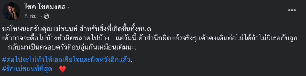 ต่อมา หนุ่มโชค ได้เคลื่อนไหวแล้วผ่าน Facebook ขอโทษภรรยาไว้ว่า “ขอโทษนะครับคุณแม่ชนนท์ สำหรับสิ่งที่เกิดขึ้นทั้งหมด เค้าอาจจะดื้อไปบ้างทำผิดพลาดไปบ้าง แต่วันนี้เค้าสำนึกผิดแล้วจริง ๆ เค้าคงเดินต่อไม่ได้ถ้าไม่มีเธอกับลูก กลับมาเป็นครอบครัวที่อบอุ่นกันเหมือนเดิมนะ. #ต่อไปจะไม่ทำให้เธอเสียใจและผิดหวังอิกแล้ว. #รักแม่ชนนท์ที่สุด” ท่ามกลางชาวโซเชียลต่างกันส่งกำลังใจให้จำนวนมาก บ้างก็บอก สงสารลูกที่ยังเล็กอยู่เลย และเรื่องราวจะเป็นยังไงเกิดจากสาเหตุอะไร เราต้องมารอฟังจากปากทั้งคู่นะคะ🥰