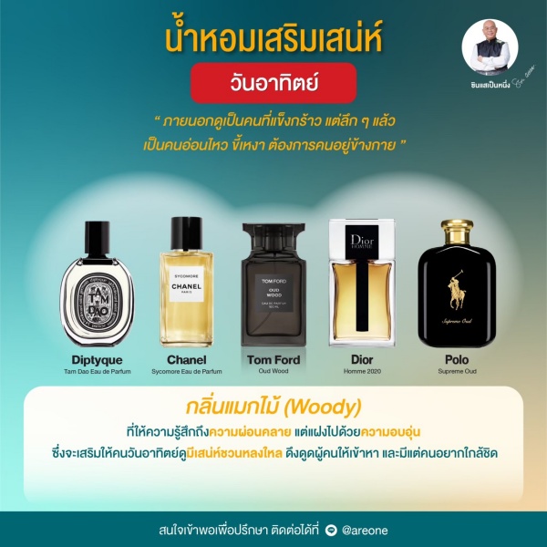 กลิ่นแมกไม้ (Woody)ที่ให้ความรู้สึกถึงความผ่อนคลาย แต่แฝงไปด้วยความอบอุ่นซึ่งจะเสริมให้คนวันอาทิตย์ดูมีเสน่ห์ชวนหลงใหล ดึงดูดผู้คนให้เข้าหา และมีแต่คนอยากใกล้ชิด