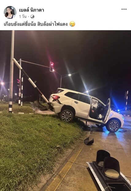 โดยสาวเบลล์ ได้โพสต์รูปทั้งข้อความไว้ว่า “เกือบยังแต่ชื่อน้อ สิบล้อผ่าไฟแดง”