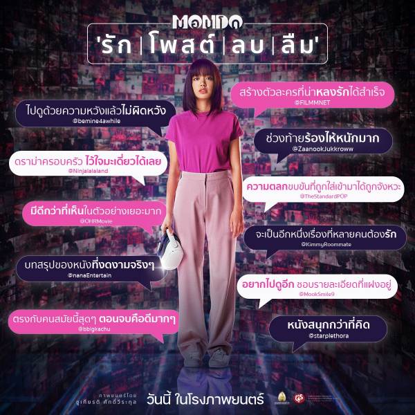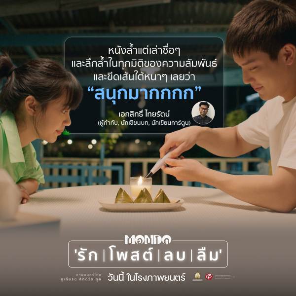 “ดีกว่าที่คิด สนุกเกินคาด ปาดน้ำตาส่งท้าย ทีมนักแสดงเล่นดีเสน่ห์ล้น ผู้กำกับทำหนังล้ำแต่ดูง่าย” รวมรีวิวชุดแรกที่ผู้ชมต่างเทใจและคะแนนบวกให้กับทุกองค์ประกอบในภาพยนตร์ไทยโรแมนติกไซไฟคอมเมดี้ MONDO รัก | โพสต์ | ลบ | ลืม ผลงานกำกับล่าสุดของผู้กำกับมากฝีมือ “มะเดี่ยว-ชูเกียรติ ศักดิ์วีระกุล” พร้อมยกขึ้นแท่น “หนังขยี้ทุกความสัมพันธ์สุดซึ้งแห่งปี”