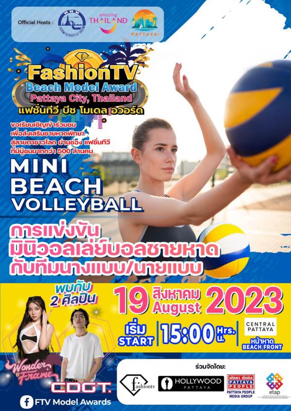 FashionTV Pattaya Beach Model Award 2023 พบกับกิจกรรมมากมาย ทั้งการประกวดนางแบบชาวไทยและชาวต่างชาติ และการแข่งขันมินิวอลเล่ย์บอลชายหาด พร้อมทั้งการแสดงมินิคอนเสิร์ตจาก ศิลปินชื่อดังอย่าง Wonder Frame, CD Guntee และทั้งดีเจชั้นนำอีกมากมาย รับชมฟรีตลอดงาน ณ ชายหาดพัทยาใต้และศูนย์การค้าเซ็นทรัล พัทยา ในวันที่19 สิงหาคม 2023