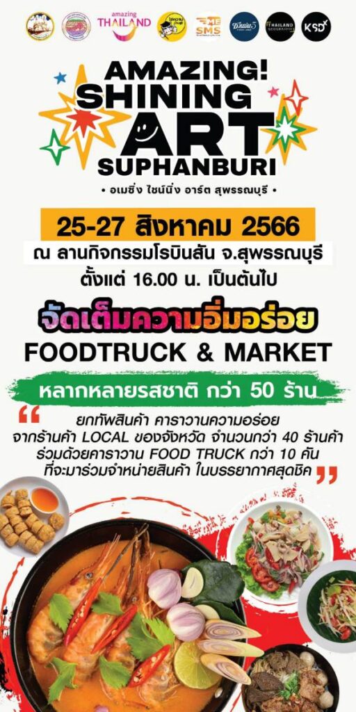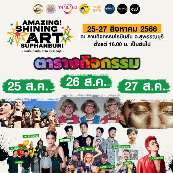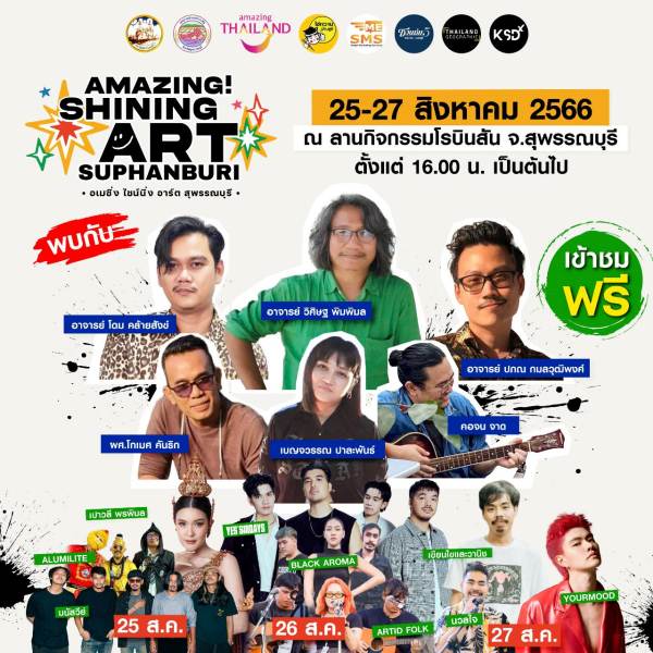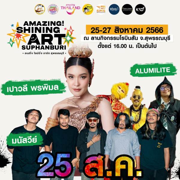 การท่องเที่ยวแห่งประเทศไทย (ททท.) สนับสนุนการจัดงานร่วมกับ จังหวัดสุพรรณบุรี จัดงาน “AMAZING SHINING ART SUPHANBURI รวมพลคน Artist” ระหว่างวันที่ 25-27 สิงหาคม พ.ศ.2566 เวลา 16.00 – 22.00 น. ณ ลานกิจกรรมโรบินส้น จังหวัดสุพรรณบุรี