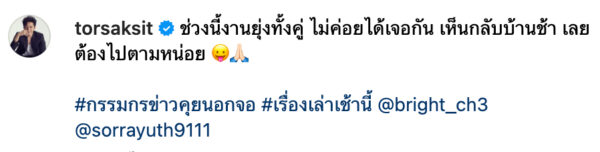 ว่ากันด้วยผู้ประกาศข่าวสาวคนดัง อย่าง ไบรท์ พิชญทัฬห์ พิธีกรคู่หู สรยุทธ์ สุทัศนะจินดา ที่ตอนนี้ต้องอ่านข่าวอย่างต่อเนื่อง ทั้งเรื่องเล่าเช้านี้และรายการกรรมการข่าวคุยนอกจอ ทำให้สามี โต๋ ศักดิ์สิทธิ์ ไปตามภรรรยา โดยเป็นการที่หนุ่มโต๋ ไปเมนต์ขณะที่กำลังดำเนินรายการอยู่