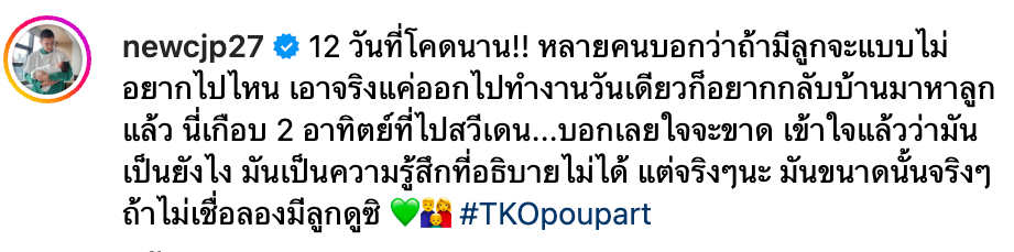 พร้อมกับอีกโพสต์ที่เป็นความในใจของหัวอกคนเป็นพ่อใจจะขาด โดยโพสต์นี้มีความในใจไว้ว่า “12 วันที่โคดนาน!! หลายคนบอกว่าถ้ามีลูกจะแบบไม่อยากไปไหน เอาจริงแค่ออกไปทำงานวันเดียวก็อยากกลับบ้านมาหาลูกแล้ว นี่เกือบ 2 อาทิตย์ที่ไปสวีเดน…บอกเลยใจจะขาด เข้าใจแล้วว่ามันเป็นยังไง มันเป็นความรู้สึกที่อธิบายไม่ได้ แต่จริง ๆ นะ มันขนาดนั้นจริง ๆ ถ้าไม่เชื่อลองมีลูกดูซิ 💚👨👩👦 #TKOpoupart“