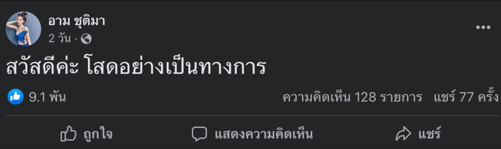 โดย สาวอาม โพสต์ผ่าน Facebook ไว้ว่า “สวัสดีค่ะ โสดอย่างเป็นทางการ” และอีกโพสต์ไว้ว่า “คบกับอีปอป นั้นมันเอาใจเก่ง แต่มันบ่งาม”
