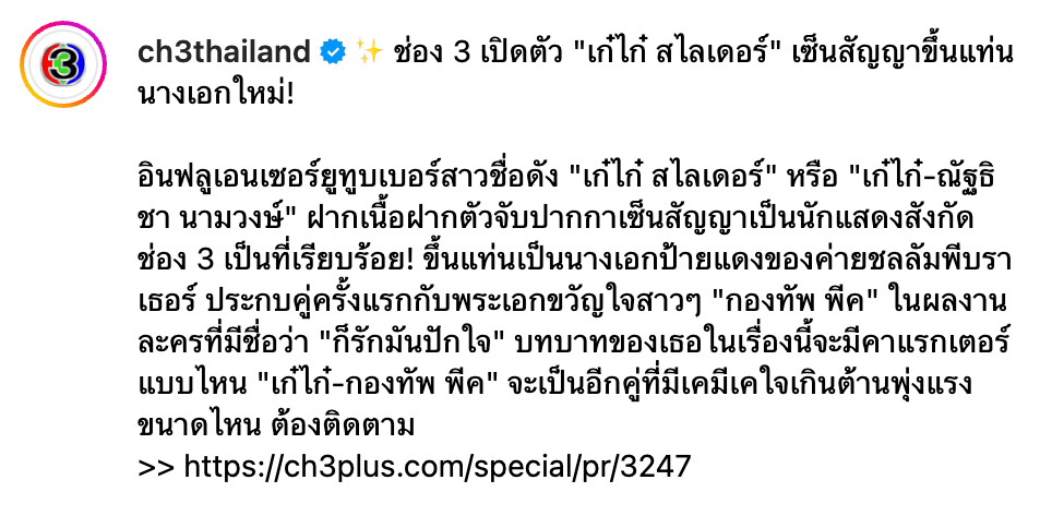 “ช่อง 3 เปิดตัว “เก๋ไก๋ สไลเดอร์” เซ็นสัญญาขึ้นแท่นนางเอกใหม่! อินฟลูเอนเซอร์ยูทูบเบอร์สาวชื่อดัง “เก๋ไก๋ สไลเดอร์” หรือ “เก๋ไก๋-ณัฐธิชา นามวงษ์” ฝากเนื้อฝากตัวจับปากกาเซ็นสัญญาเป็นนักแสดงสังกัดช่อง 3 เป็นที่เรียบร้อย! ขึ้นแท่นเป็นนางเอกป้ายแดงของค่ายชลลัมพีบราเธอร์ ประกบคู่ครั้งแรกกับพระเอกขวัญใจสาว ๆ “กองทัพ พีค” ในผลงานละครที่มีชื่อว่า “ก็รักมันปักใจ” บทบาทของเธอในเรื่องนี้จะมีคาแรกเตอร์แบบไหน “เก๋ไก๋-กองทัพ พีค” จะเป็นอีกคู่ที่มีเคมีเคใจเกินต้านพุ่งแรงขนาดไหน ต้องติดตาม”