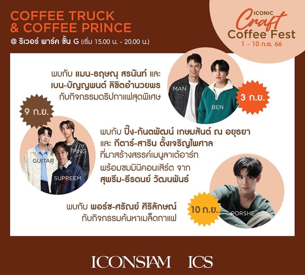 พบกับความพิเศษสุดเอ็กซ์คลูซีฟที่ไอคอนสยามมอบให้คนรักกาแฟต้องหัวใจเต้นรัว กับ เหล่า Coffee Prince 6 หนุ่มหล่อมาเสิร์ฟความหอมกรุ่นกลิ่นกาแฟ เพิ่มคาเฟอีนให้ทุกคน โดยวันที่ 3 กันยายน 2566 พบกับ แมน-ธฤษณุ สรนันท์ และ เบน-บัญญพนต์ ลิขิตอำนวยพร สองหนุ่มนักแสดงจากซีรีย์ “ค่อย ๆ รัก Step by Step” จะมาพร้อมกิจกรรมดริปกาแฟสุดพิเศษสำหรับแฟนคลับ ส่วนวันที่ 9 กันยายน 2566 พบกับ ปิ๊ง-กันตพัฒน์ เกษมสันต์ ณ อยุธยา ควง กีตาร์-สาริน ตั้งเจริญไพศาล มาสร้างสรรค์ลาเต้อาร์ท พร้อมเพลิดเพลินกับมินิคอนเสิร์ตสุดพิเศษจาก สุพรีม-ธีรดนย์ วัฒนพันธ์ และวันที่ 10 กันยายน 2566 พบกับ นักแสดงหนุ่มหล่อ พอร์ช-ศรัณย์ ศิริลักษณ์ ที่จะร่วมทำกิจกรรมค้นหาเมล็ดกาแฟเพื่อสร้างโมเม้นต์ดี ๆ กับเหล่าสาวกกาแฟภายในงานอีกด้วย